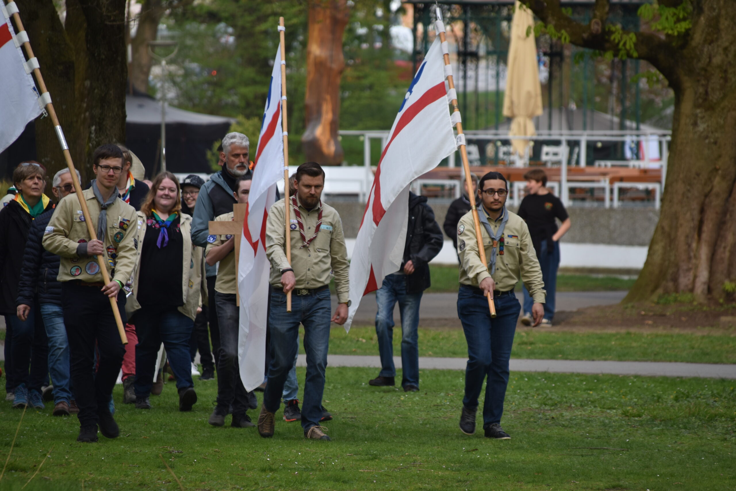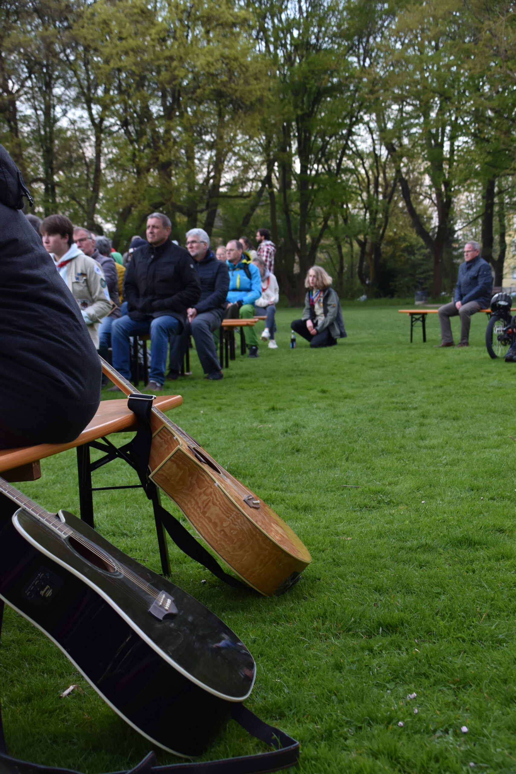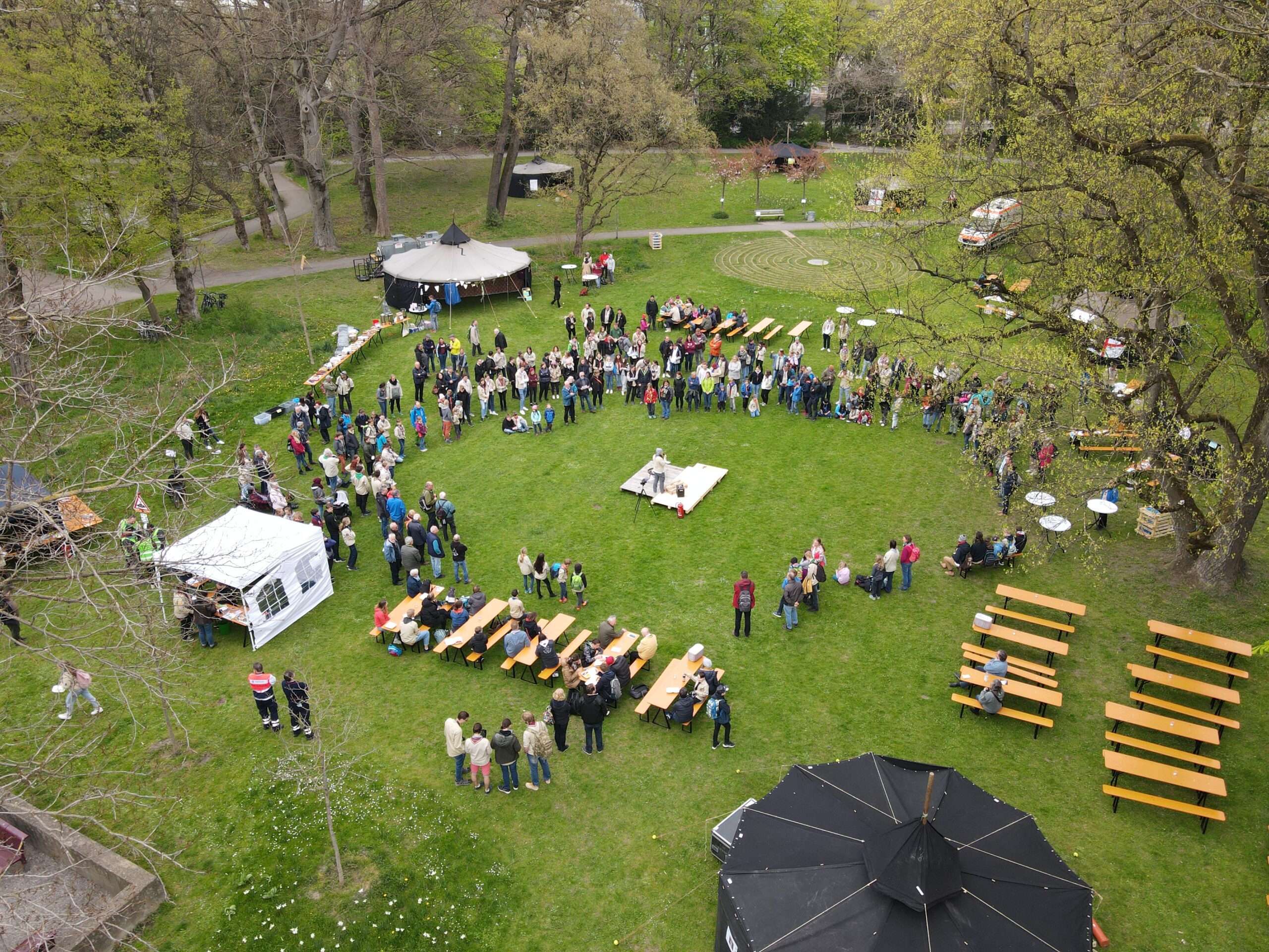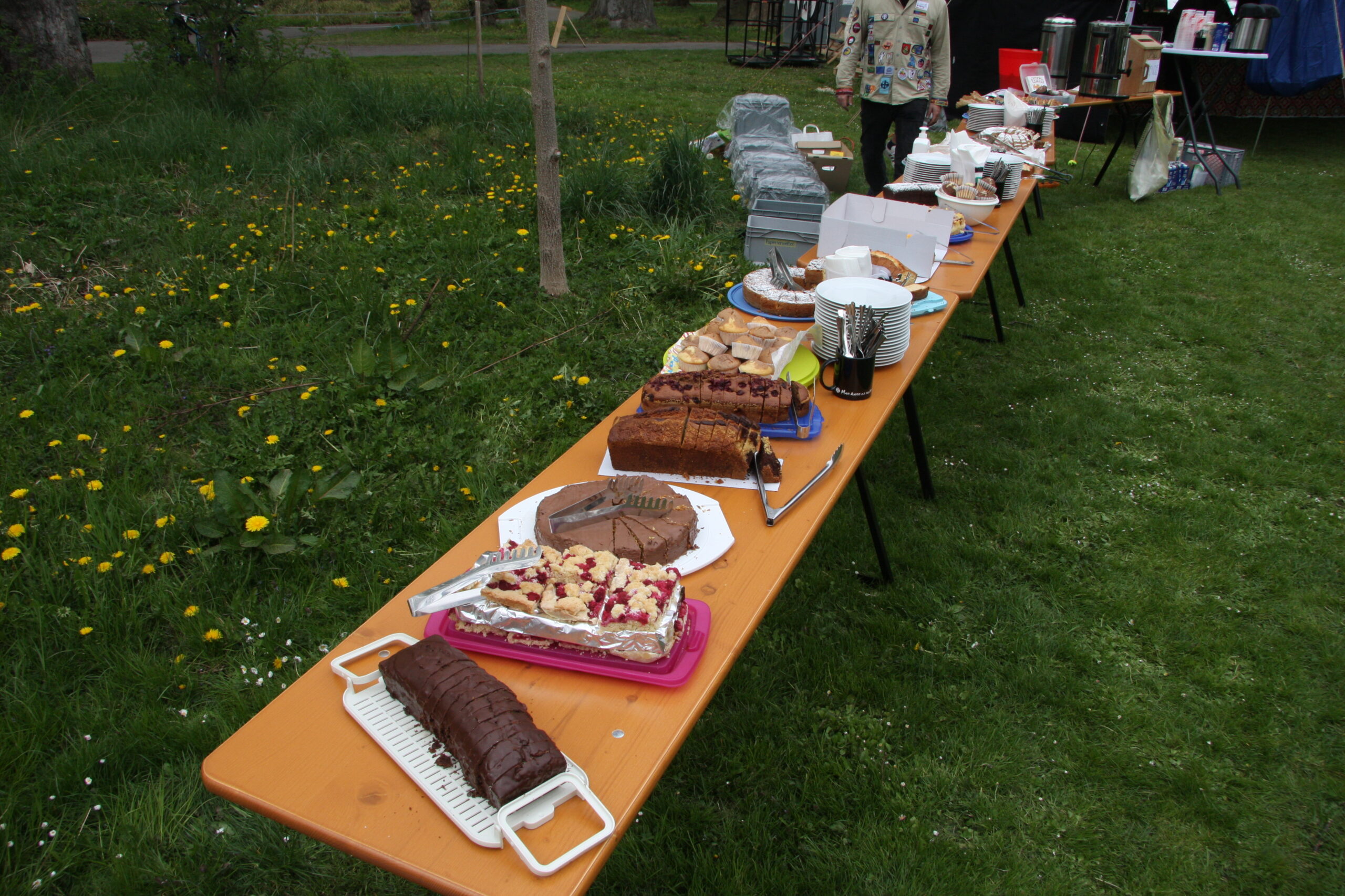 Ab 14 Uhr kamen über 600 Besucher:innen trotz vieler Wolken auf das Gelände am Wittelsbacherpark. Unsere Diözesankuratin Viola begrüßte auf der Wiese alle Gäst:innen zu dem Jubiläum der Augsburger Pfadfinder. Im Anschluss war es möglich, bei Kaffee und Kuchen am Biertisch mit alten Bekannten wieder ins Gespräch zu kommen. Bei zahlreichen dieser Begegnungen waren Jahrzehnte seit dem letzten Treffen vergangen. Entsprechend intensiv war der Austausch. Bald war auf dem gesamten Platz der Pfadfindergeist sehr stark zu erleben.