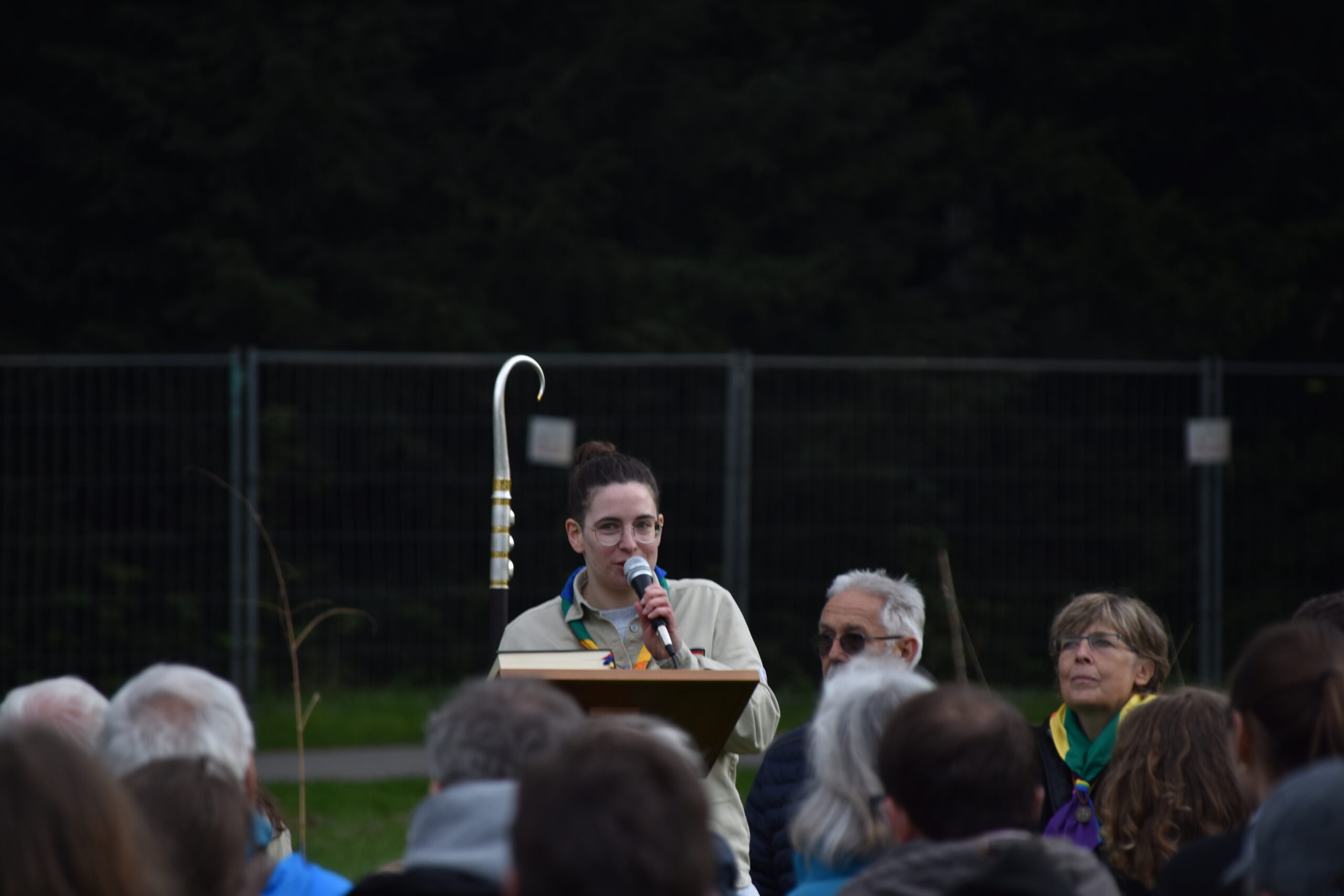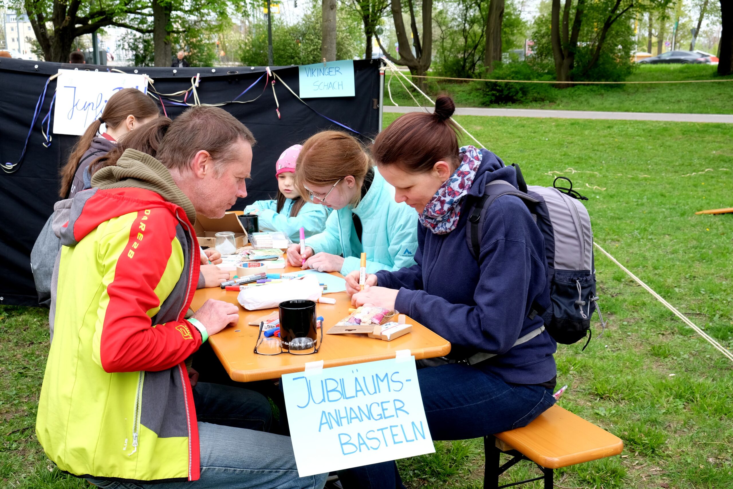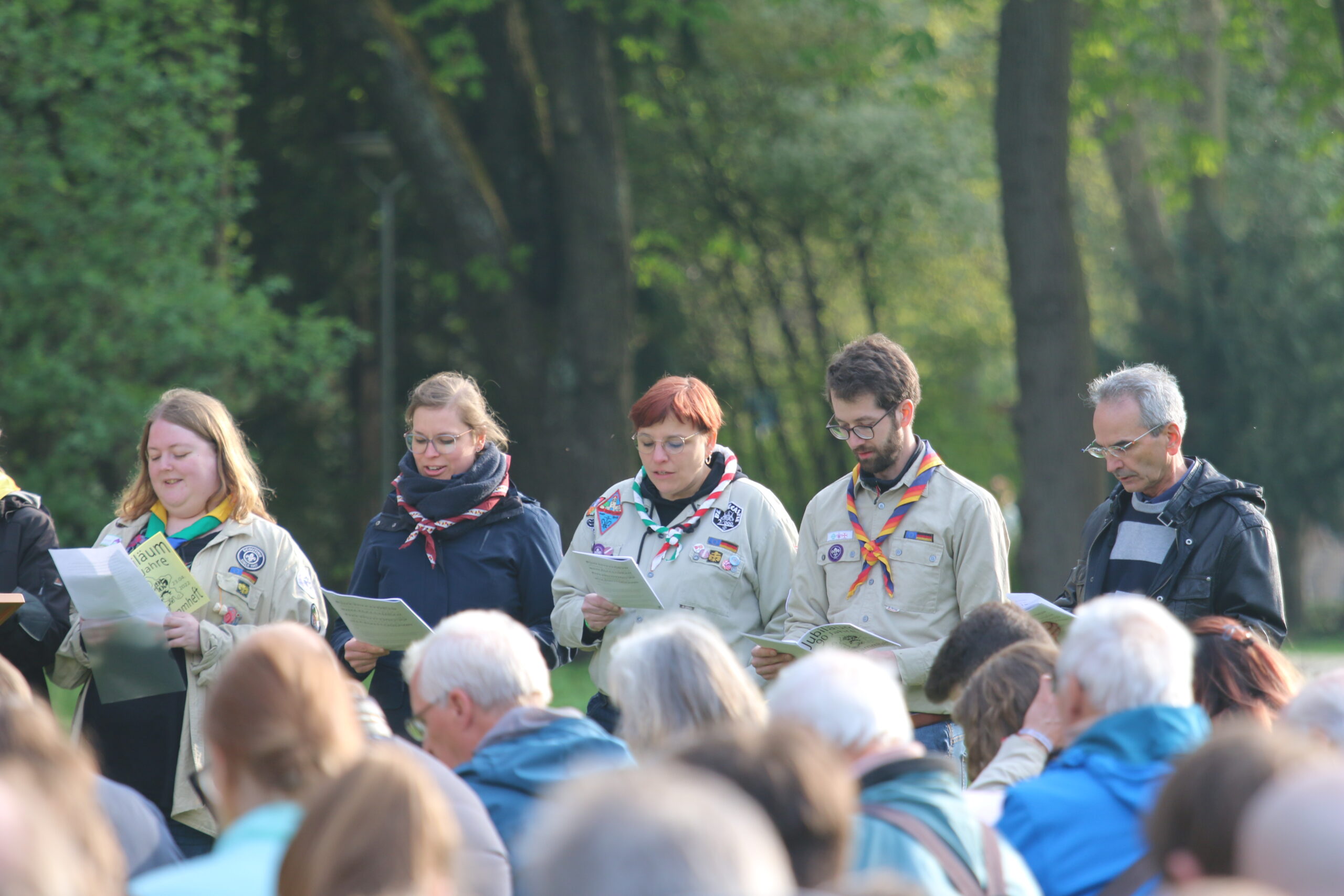 Ab 14 Uhr kamen über 600 Besucher:innen trotz vieler Wolken auf das Gelände am Wittelsbacherpark. Unsere Diözesankuratin Viola begrüßte auf der Wiese alle Gäst:innen zu dem Jubiläum der Augsburger Pfadfinder. Im Anschluss war es möglich, bei Kaffee und Kuchen am Biertisch mit alten Bekannten wieder ins Gespräch zu kommen. Bei zahlreichen dieser Begegnungen waren Jahrzehnte seit dem letzten Treffen vergangen. Entsprechend intensiv war der Austausch. Bald war auf dem gesamten Platz der Pfadfindergeist sehr stark zu erleben.