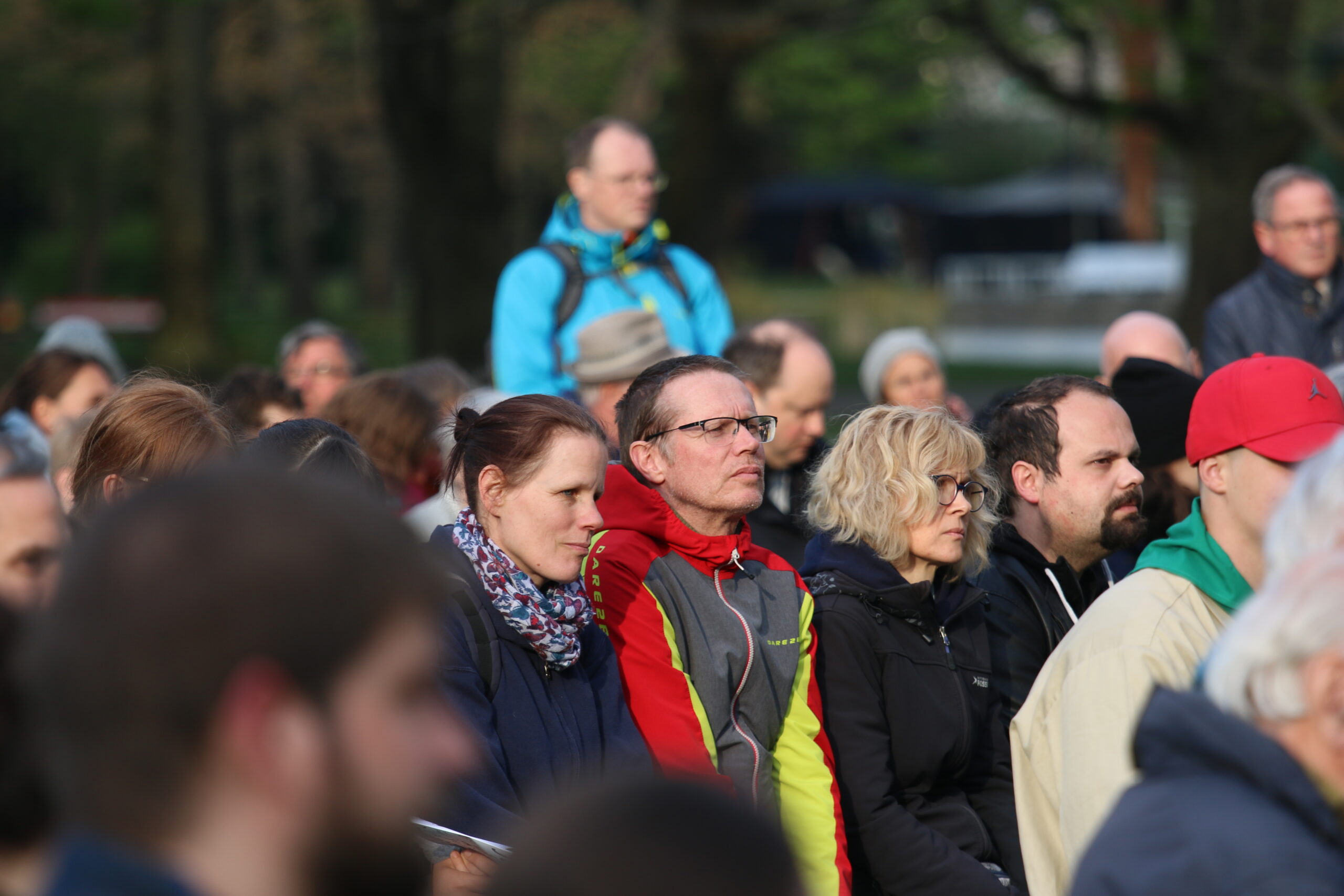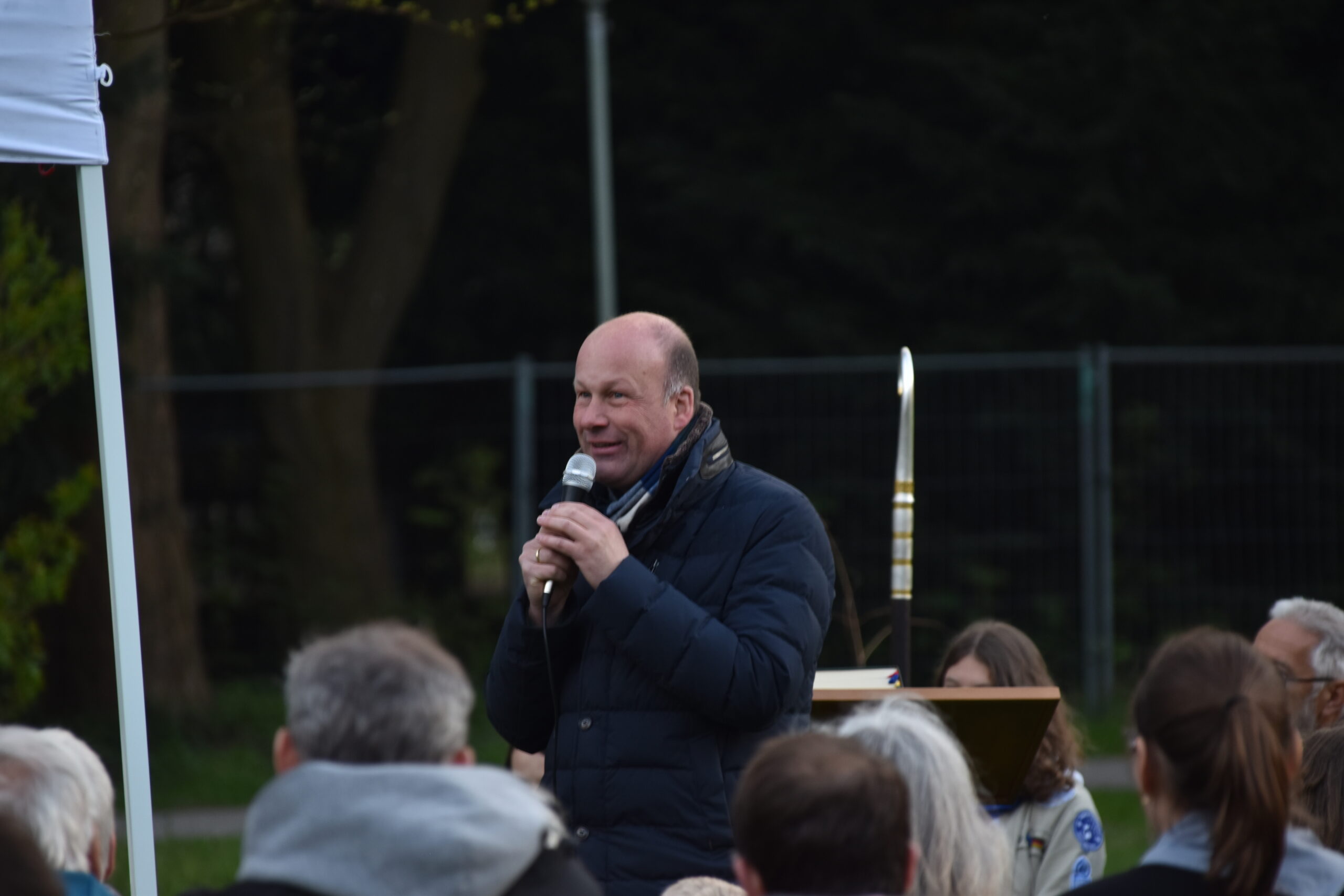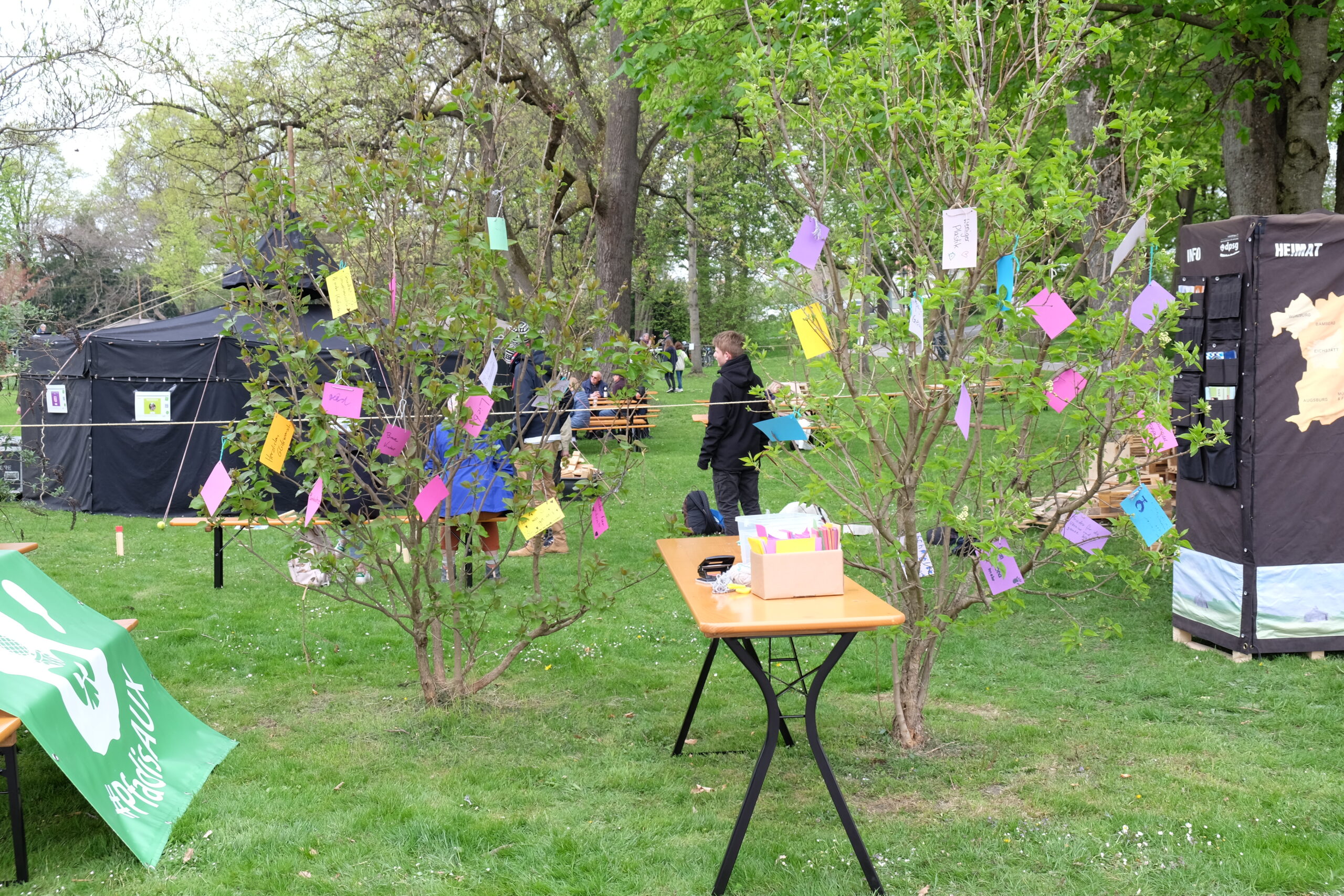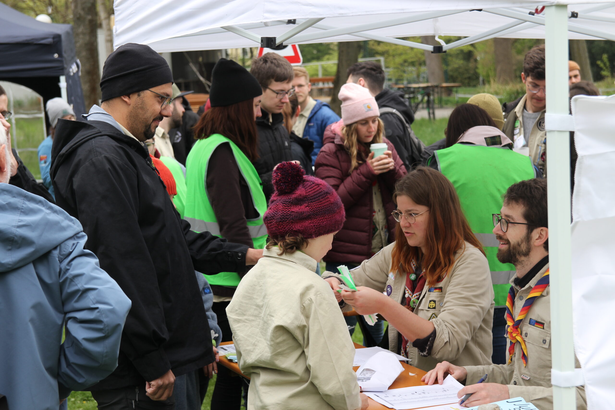 Ab 14 Uhr kamen über 600 Besucher:innen trotz vieler Wolken auf das Gelände am Wittelsbacherpark. Unsere Diözesankuratin Viola begrüßte auf der Wiese alle Gäst:innen zu dem Jubiläum der Augsburger Pfadfinder. Im Anschluss war es möglich, bei Kaffee und Kuchen am Biertisch mit alten Bekannten wieder ins Gespräch zu kommen. Bei zahlreichen dieser Begegnungen waren Jahrzehnte seit dem letzten Treffen vergangen. Entsprechend intensiv war der Austausch. Bald war auf dem gesamten Platz der Pfadfindergeist sehr stark zu erleben.
