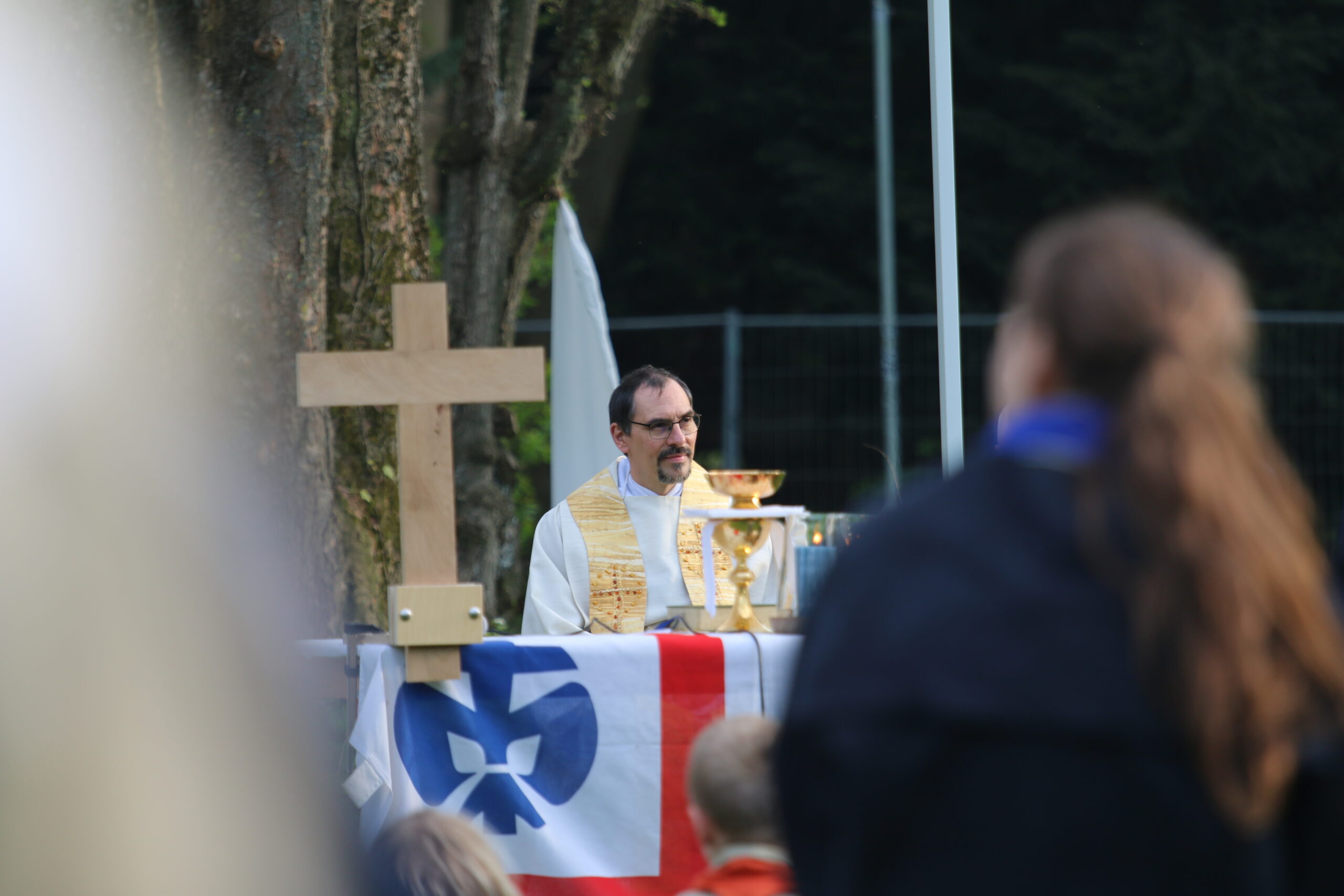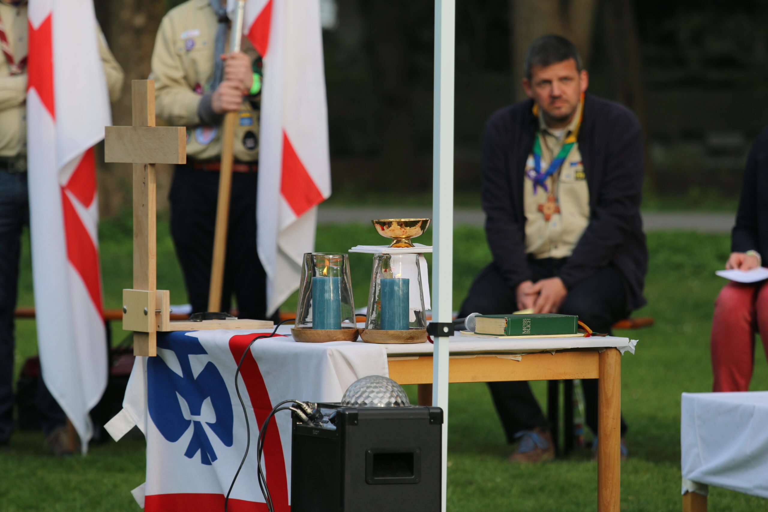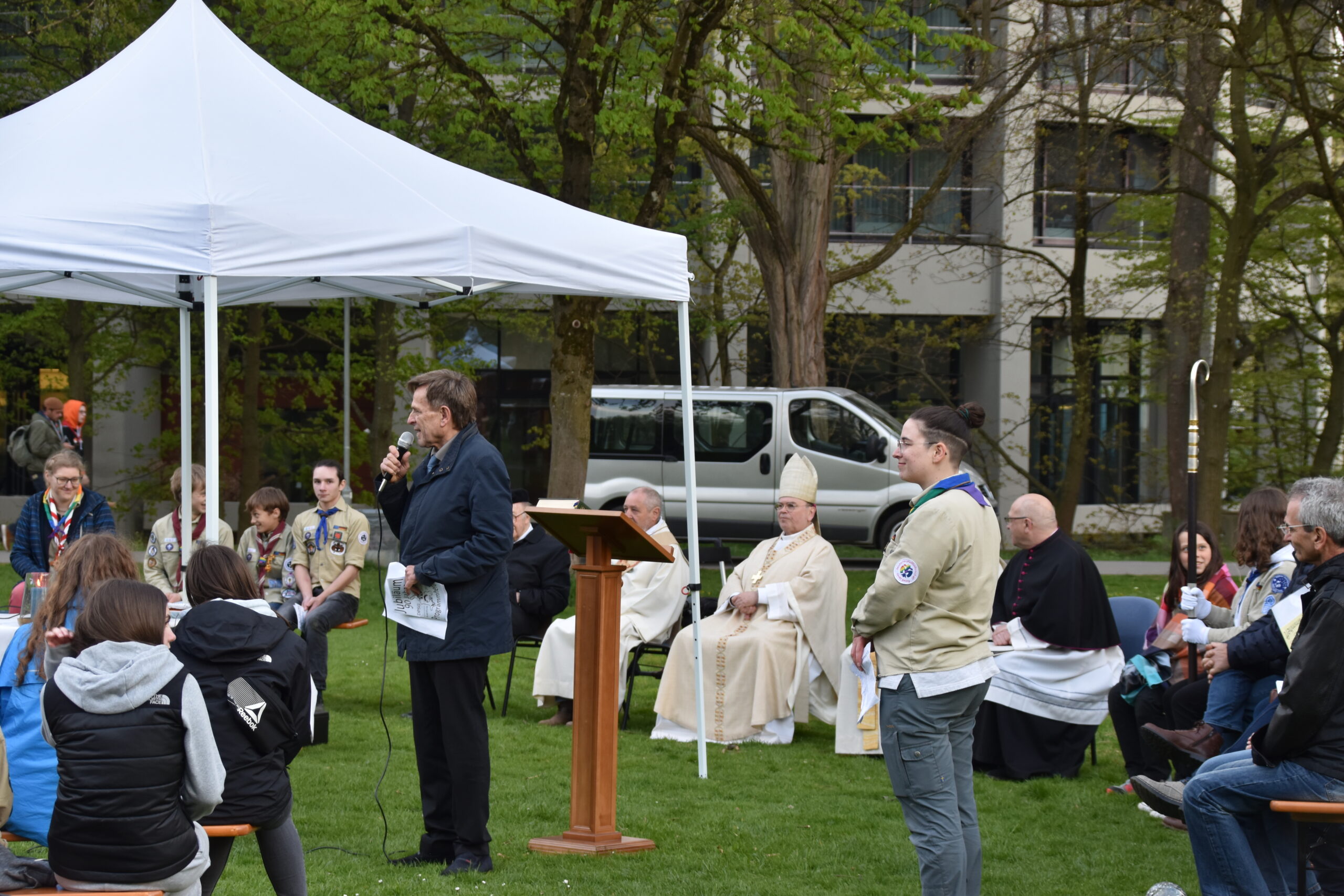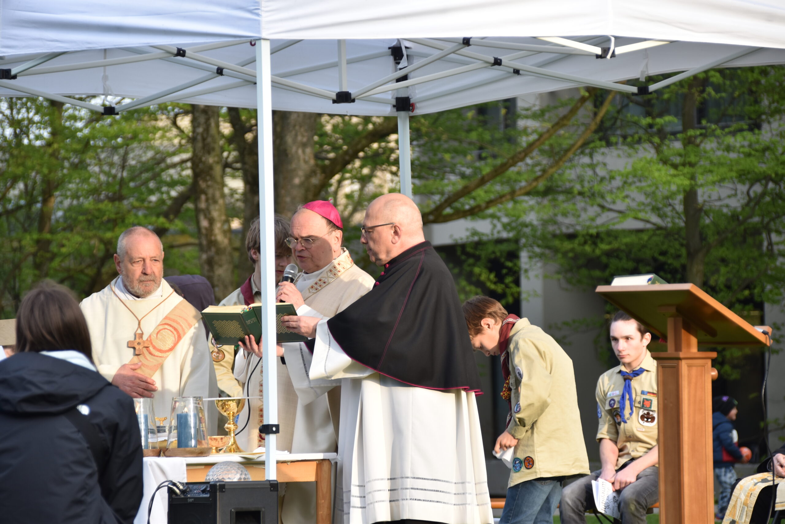 Unser Gottesdienst auf der Wiese hinter dem Hotelturm mit Bischof Bertram Meier fand ganz pfadfinderisch unter freiem Himmel statt. Auch er war bei den Wölflingen und erzählte einige Anekdoten aus dieser Zeit. Dabei hob er die aktive Ausübung des Glaubens durch gute Taten im Verband hervor.