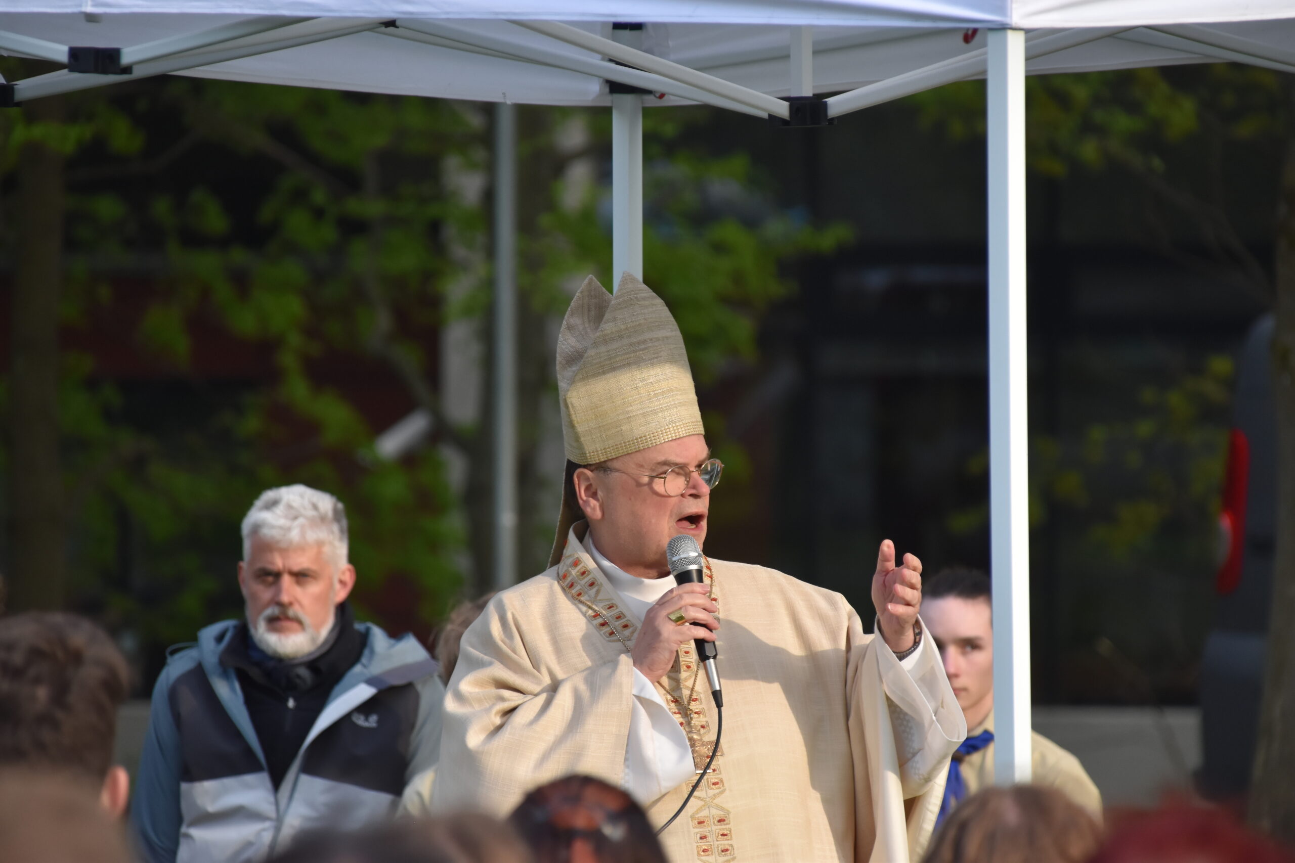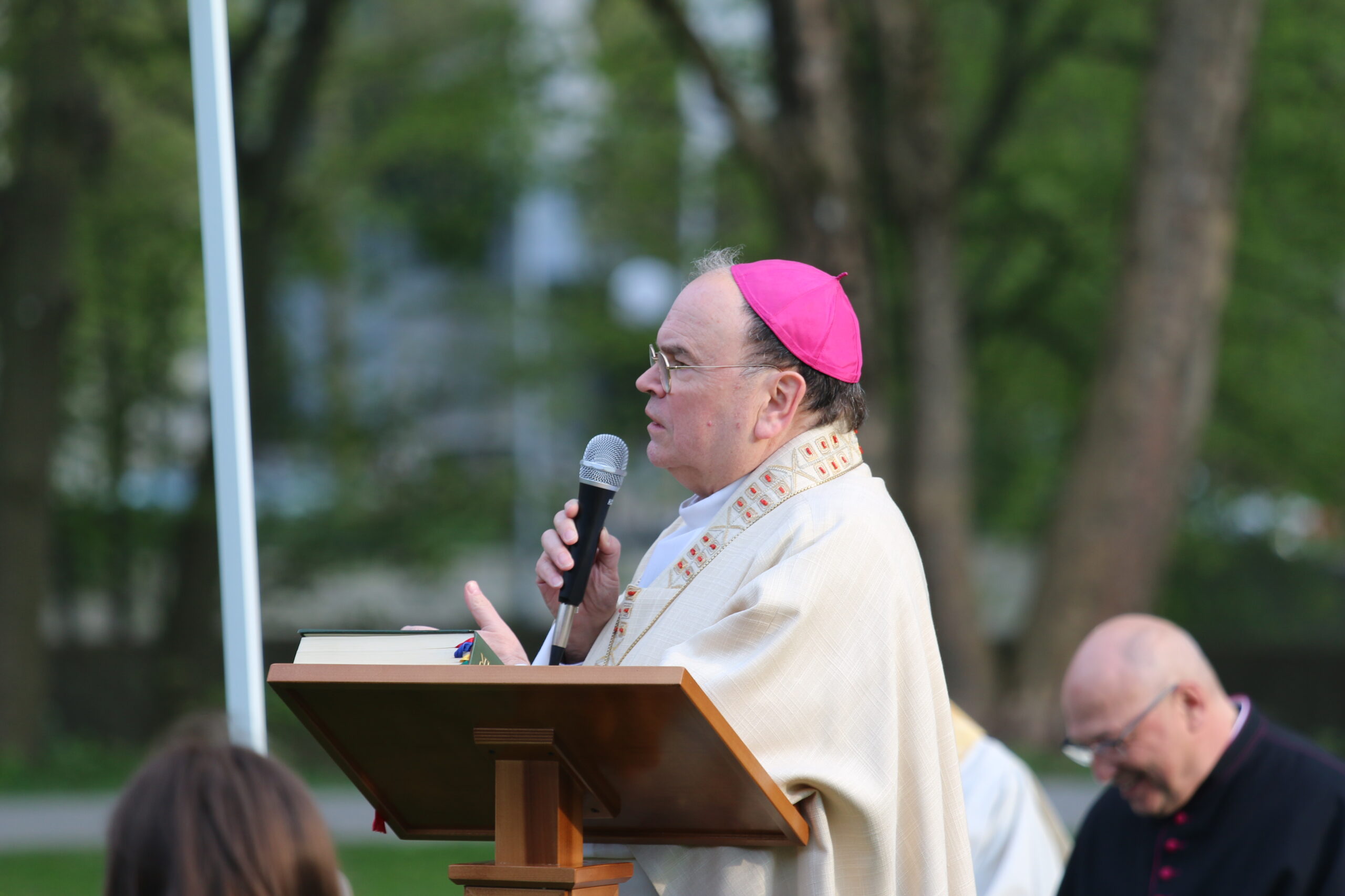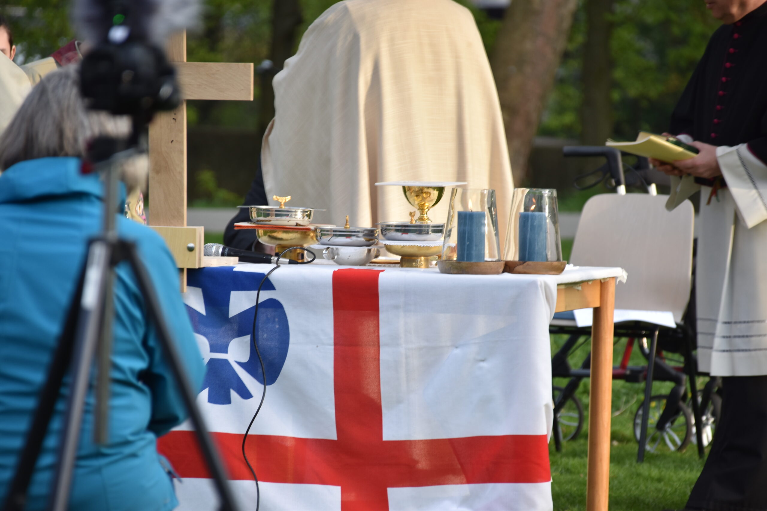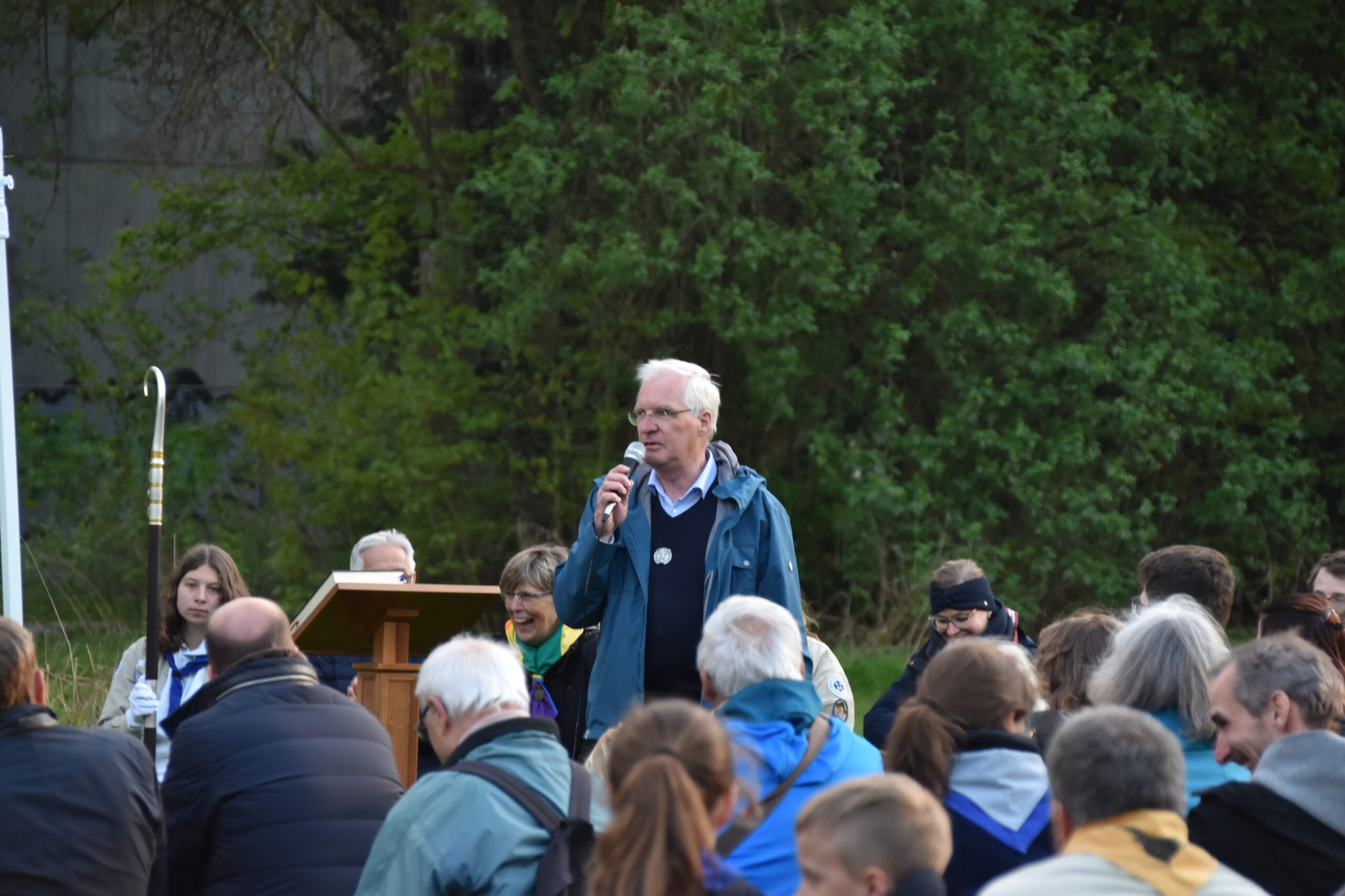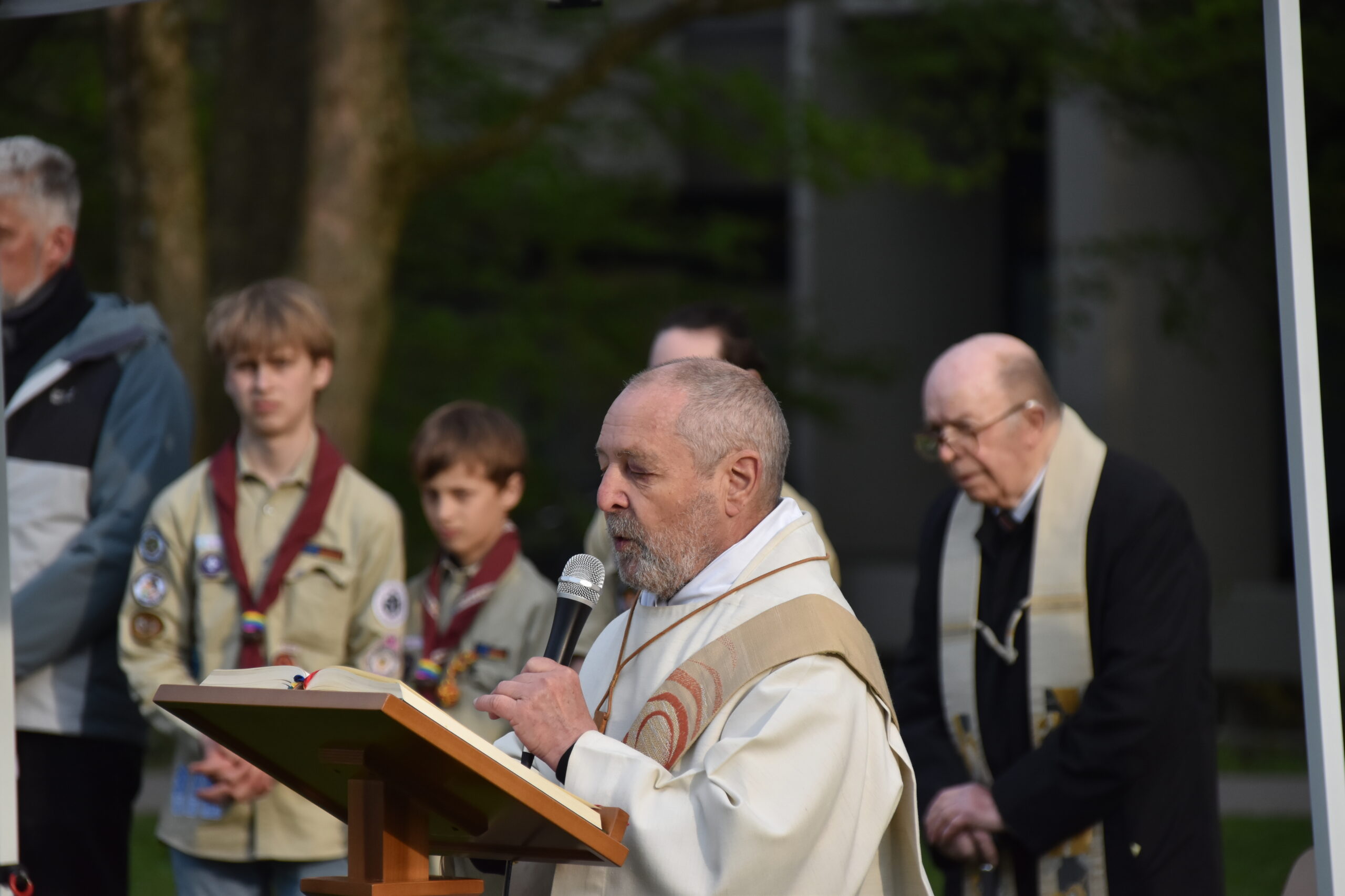 Unser Gottesdienst auf der Wiese hinter dem Hotelturm mit Bischof Bertram Meier fand ganz pfadfinderisch unter freiem Himmel statt. Auch er war bei den Wölflingen und erzählte einige Anekdoten aus dieser Zeit. Dabei hob er die aktive Ausübung des Glaubens durch gute Taten im Verband hervor.